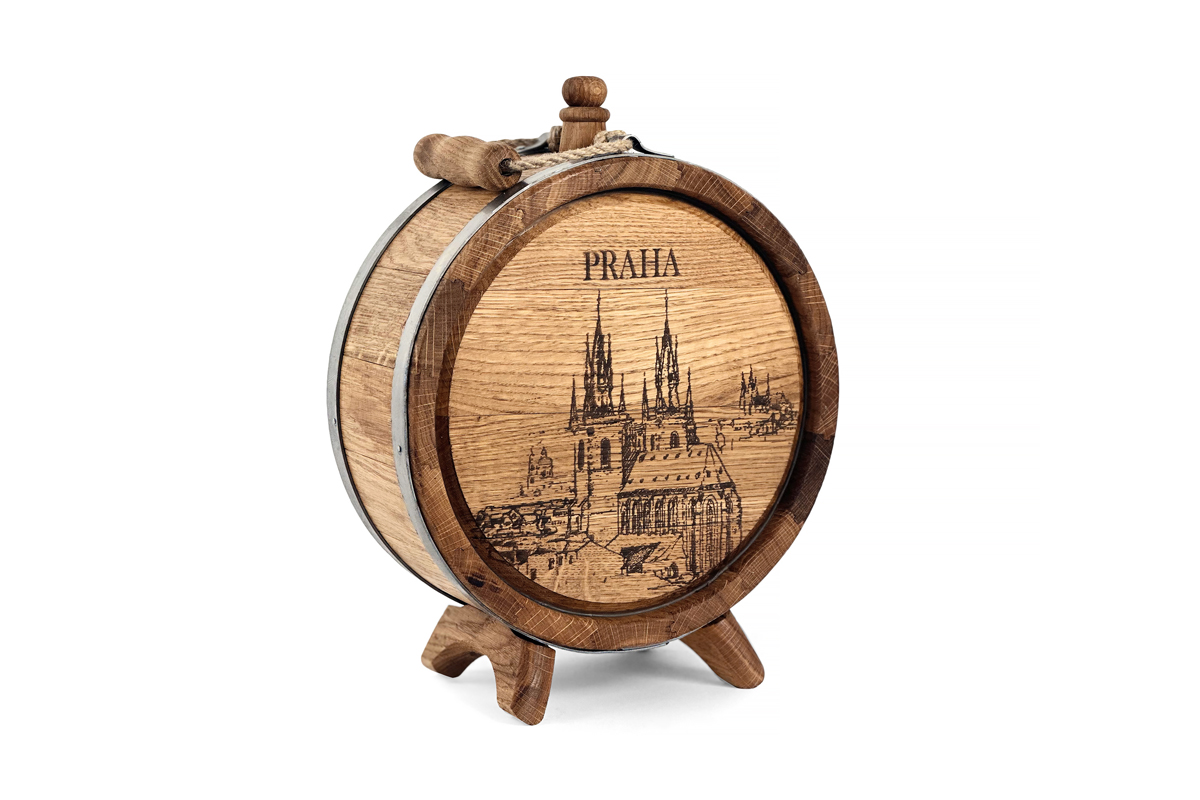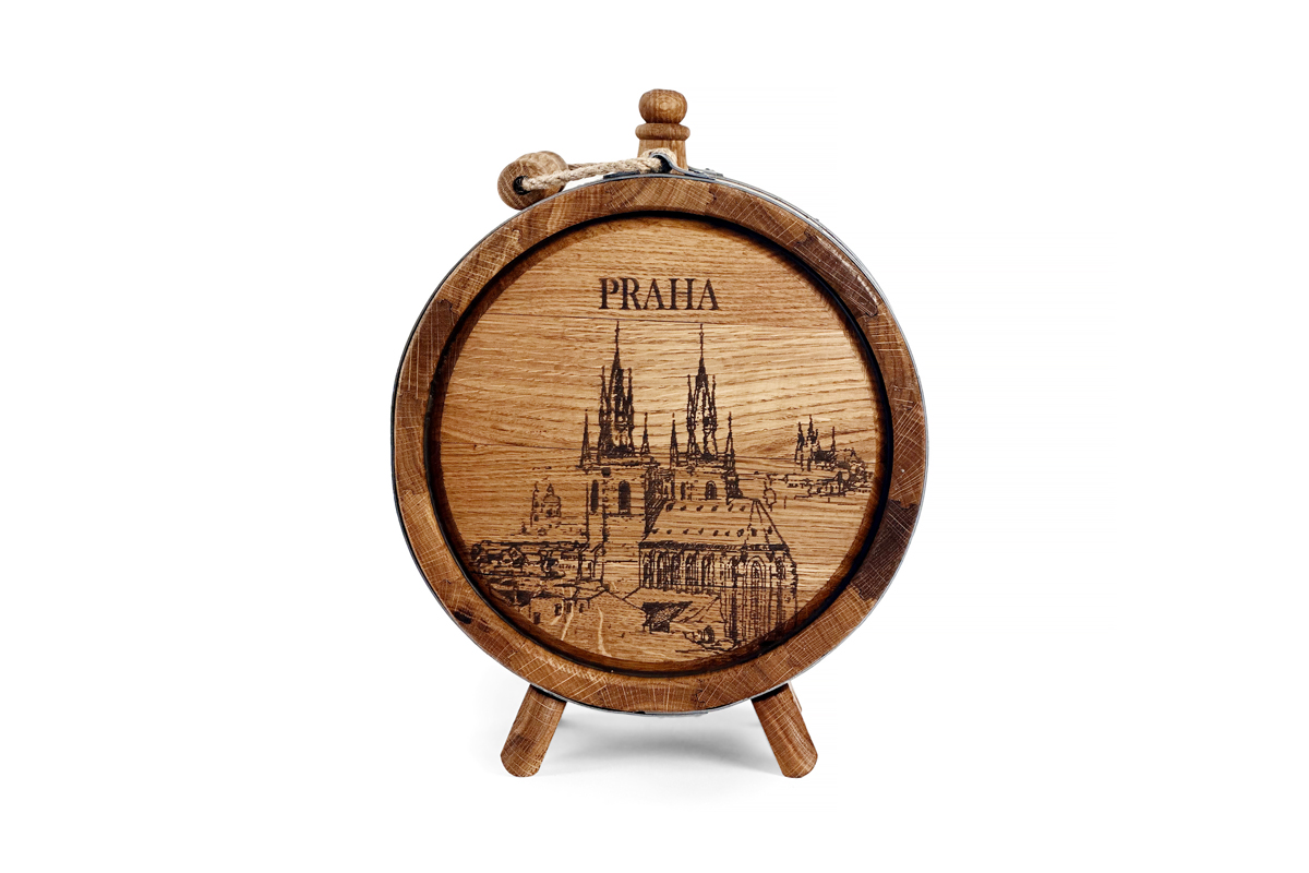 Dubová placatka s motivem Prahy – stylový a praktický doplněk pro milovníky vína a lihovin