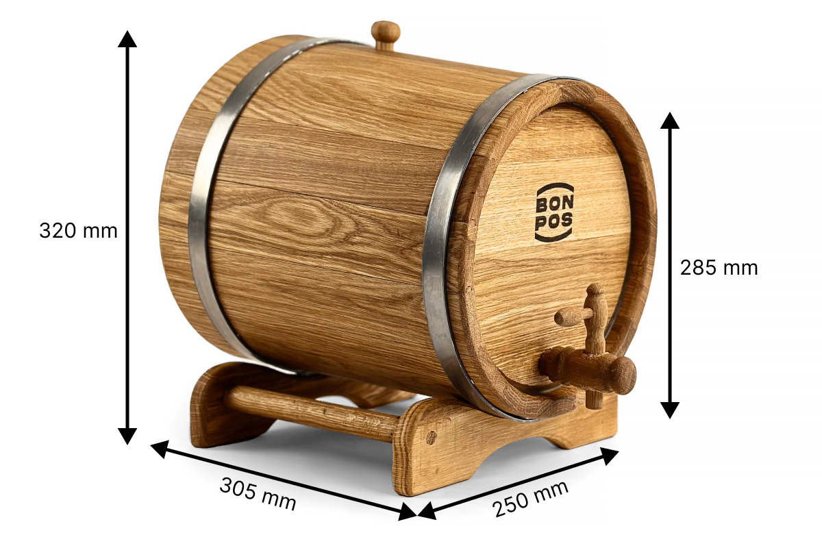 Vyroben z přírodního dubového dřeva bez vnitřního vypalování, zachovává přirozené aroma nápoje a umožňuje jemné zrání bez silného dubového tónu.